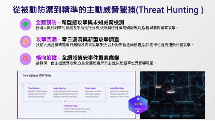 | 威脅調查 | 日誌分散、上下文缺失 | Storyline 技術快速串聯事件、ActiveEDR 深度搜尋 |